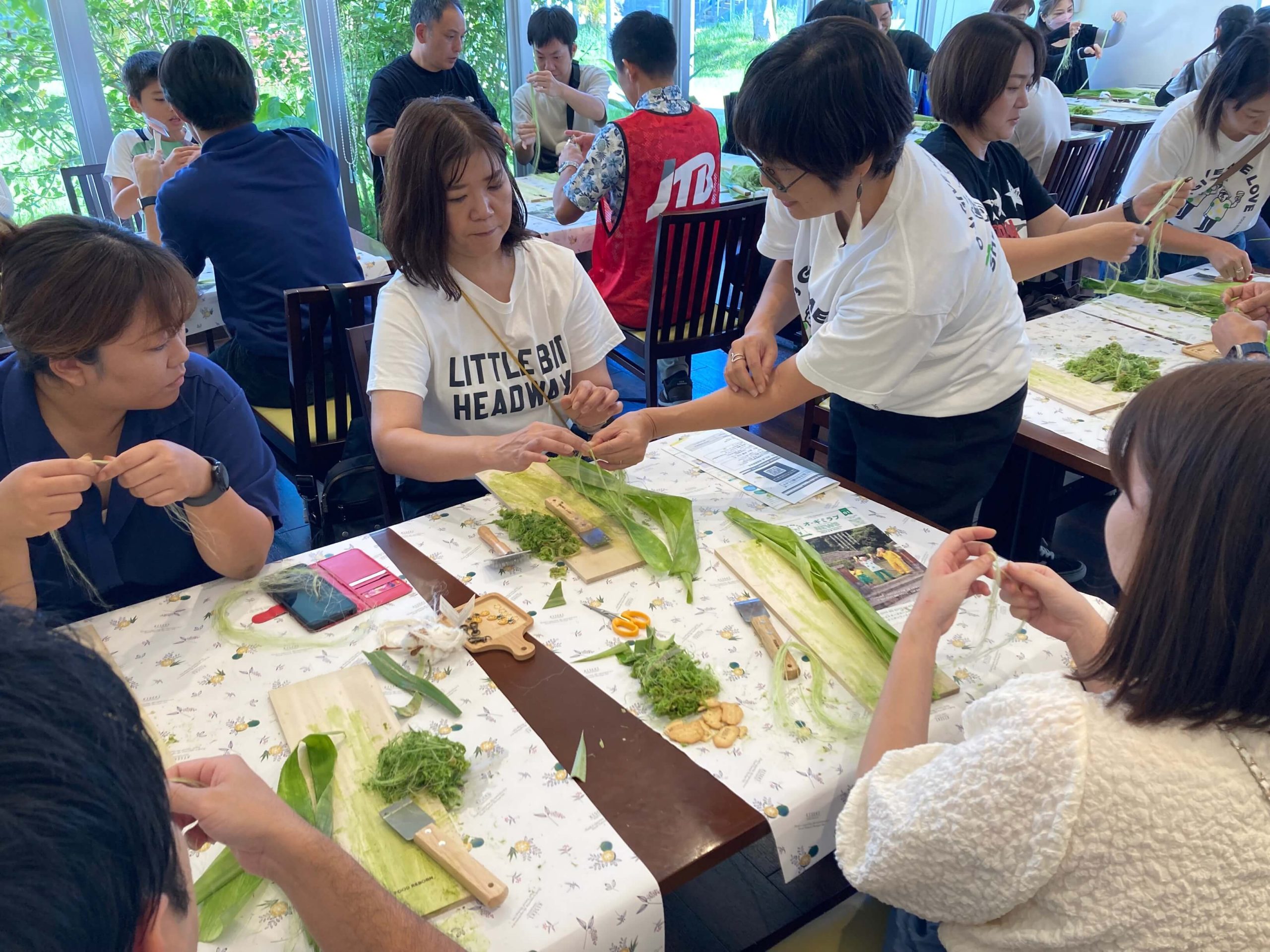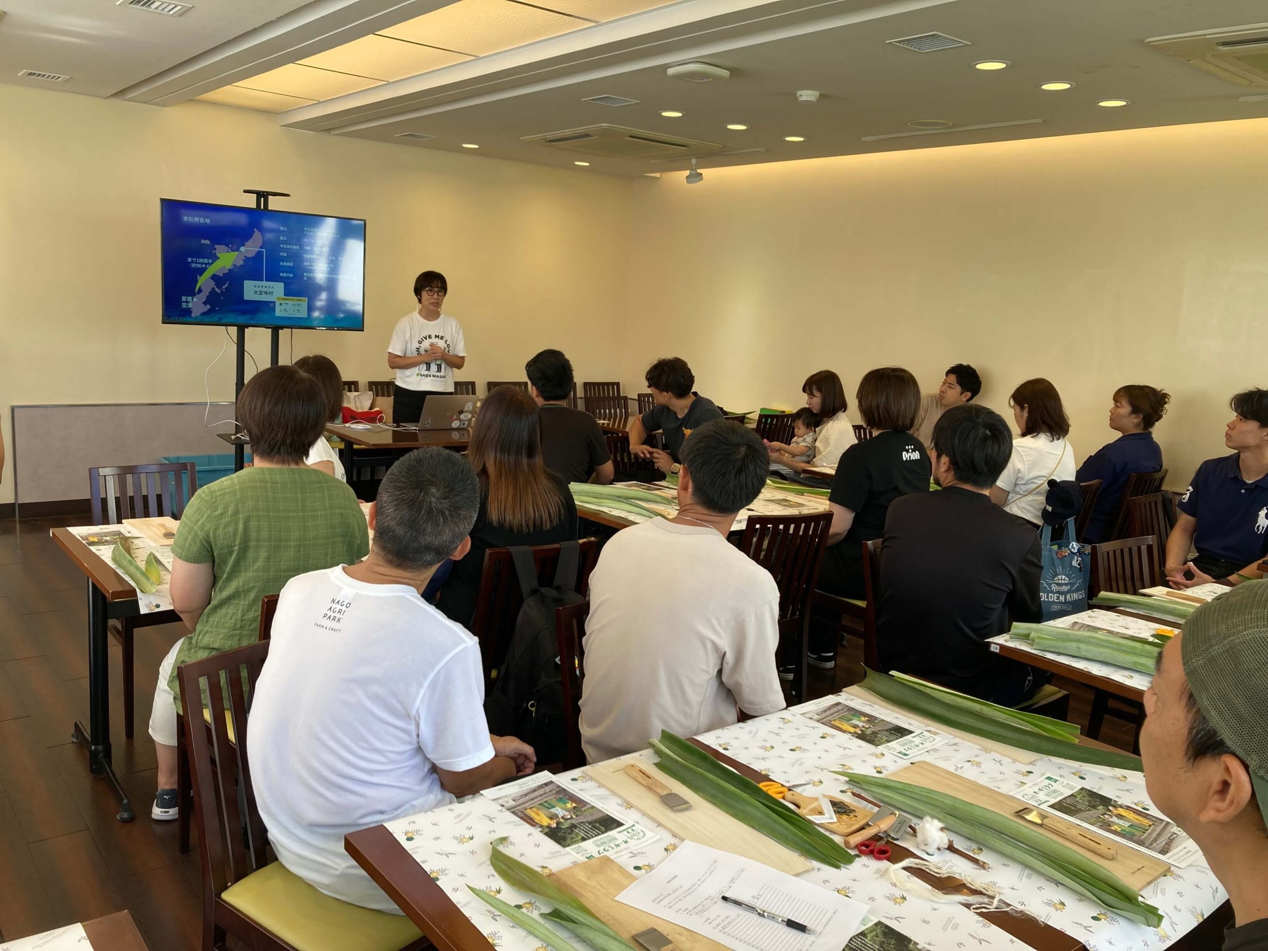 プログラムは2部構成となり、はじめに、当社運営の『なごアグリパーク』で「フードリボン」による、パイナップルやバナナの葉を利活用した「生産者の顔が見える繊維」、「自然に循環する衣服」の講演と「パイナップル葉繊維取り出し体験」ワークショップを行いました。