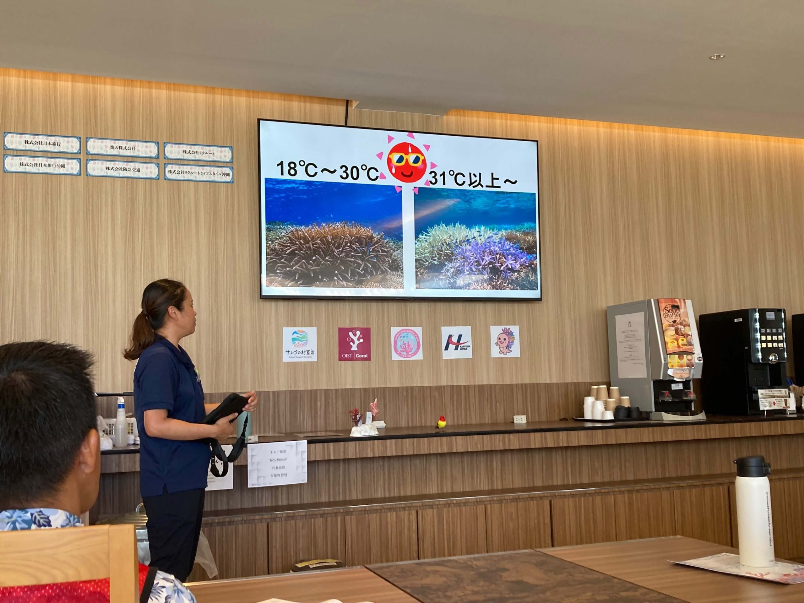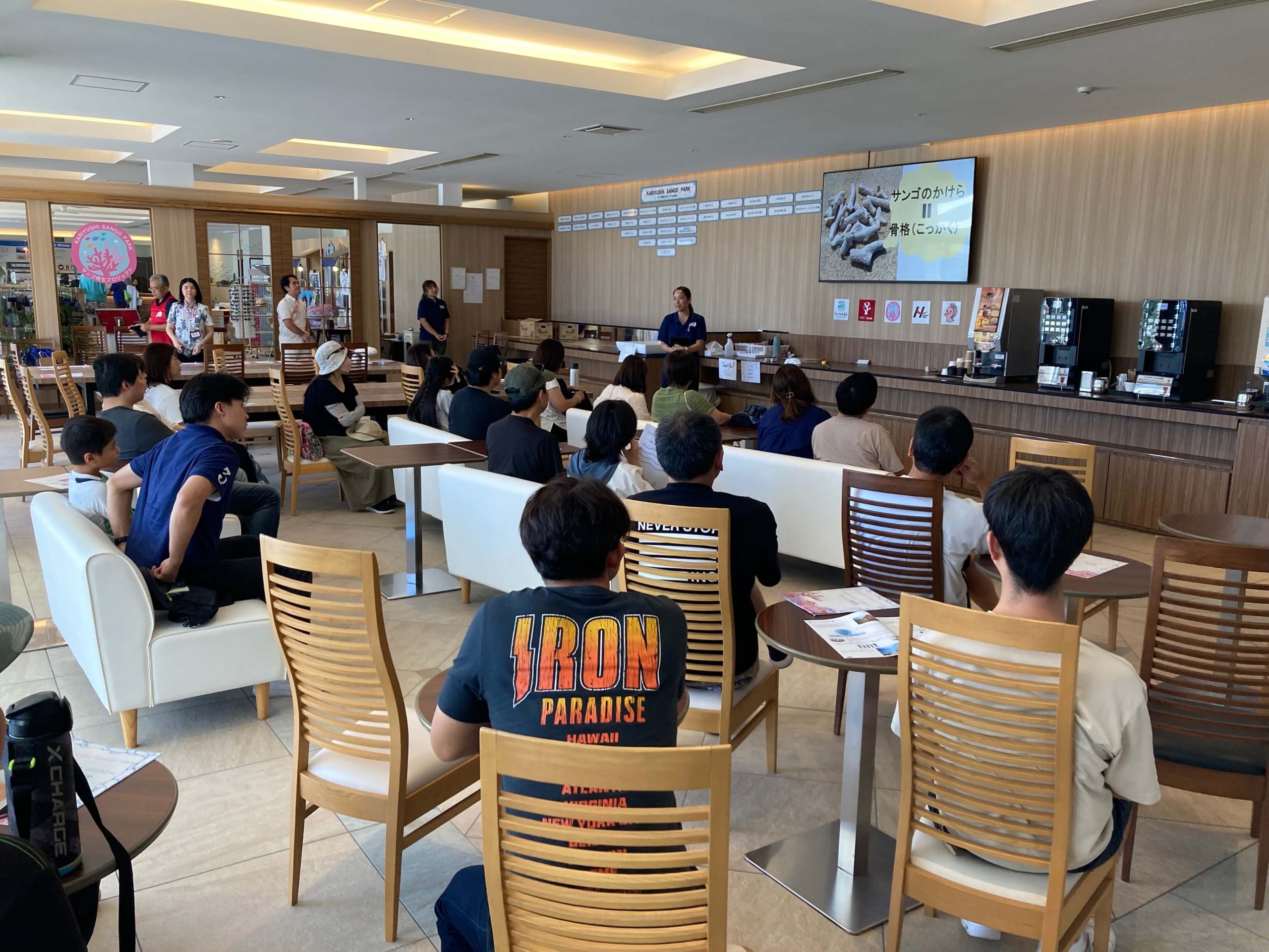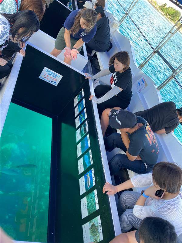 海洋環境講習では、サンゴの生態やサンゴ礁が白化現象により危機的状況にあること、台風とサンゴ礁の関係などを学びました。その後、グラスボートでサンゴ礁のスポットへ移動し、ガイドの説明を聞きながらサンゴの種類やサンゴの周りに生息する魚たちを観察しました。