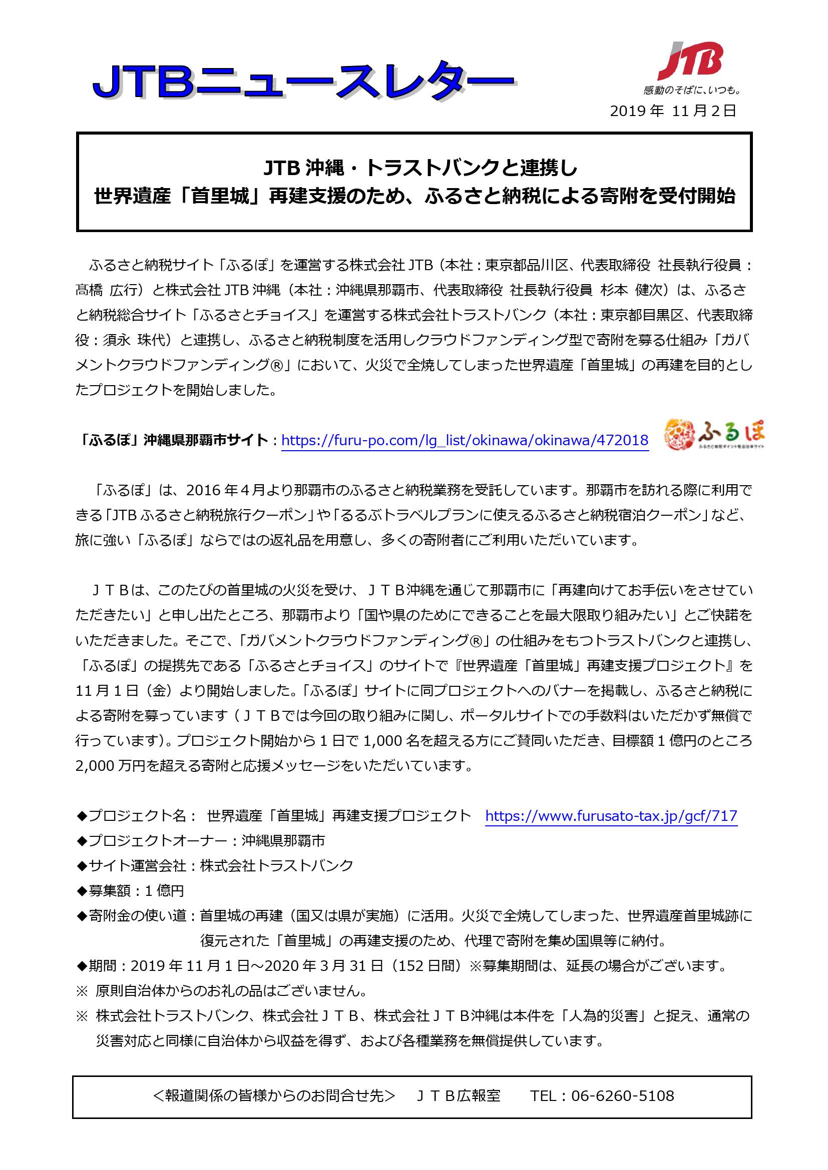 【ニュースリリース】沖縄JTB・トラストバンクと連携し世界遺産「首里城」再建支援のため、ふるさと納税による寄附を受付開始