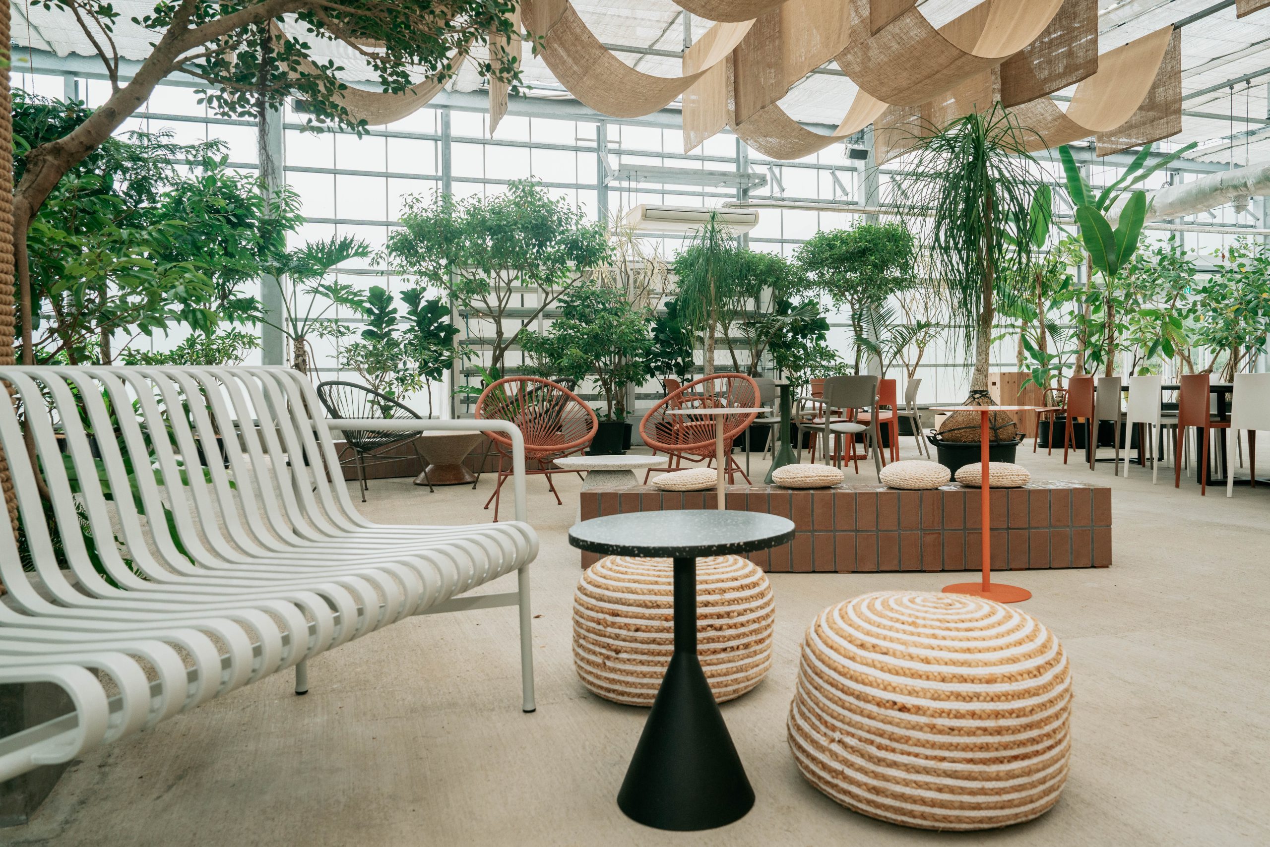 大型ビニールハウス内に、様々な植物を配置し、卵やフルーツをふんだんに使ったスイーツが楽しめる「Sweets Garden(カフェ)」。