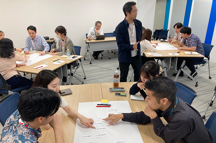 JTBグループでは、多彩なプログラムを備えた教育プラットフォーム「J-Campus」により、社員が自由に学べる機会を提供しています。加えて、沖縄JTBでは実践的なビジネススキルの向上や、沖縄の観光資源に対する理解を深めるために、社内セミナー「ステップアップ+」も開催。講義スタイルに加え、グループワークを通して他部署の社員との意見交換により、双方の能力開発意欲も高めています。